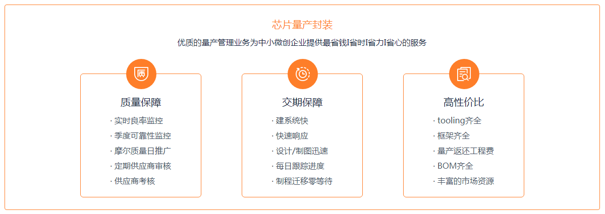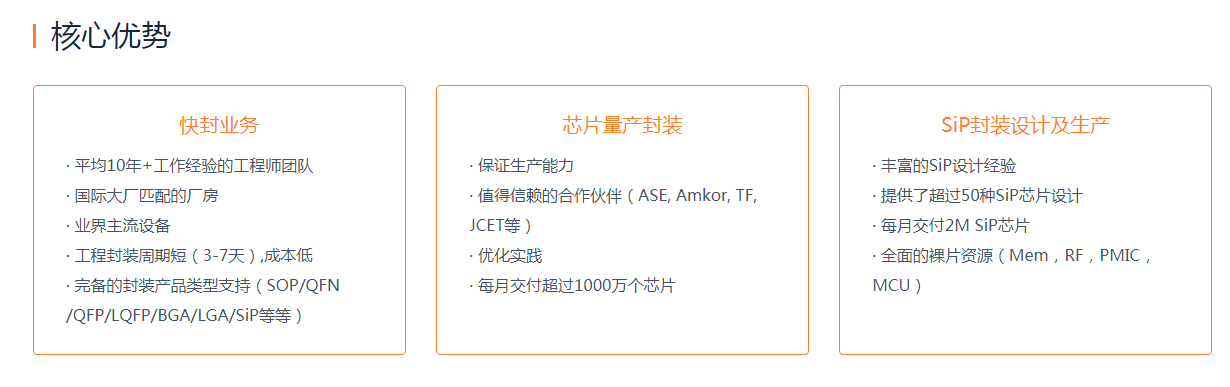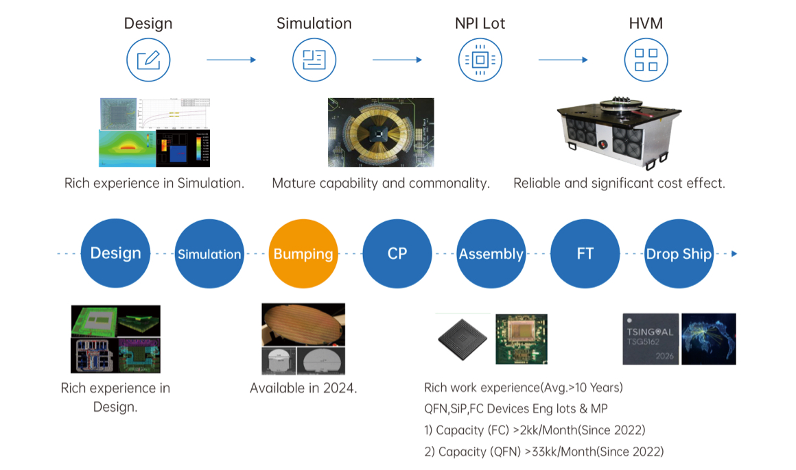 芯火燎圆在产品研发阶段提供优质高效的快封服务;同时拥有经验丰富的方案开发和SiP设计团队,为客户提供SiP产品从设计、仿真、打样到量产一站式交付;依托于国内外主流封装厂的长期战略合作关系,为客户提供全流程的量产管理服务,在封装阶段的交期、产能及质量提供有效保障。